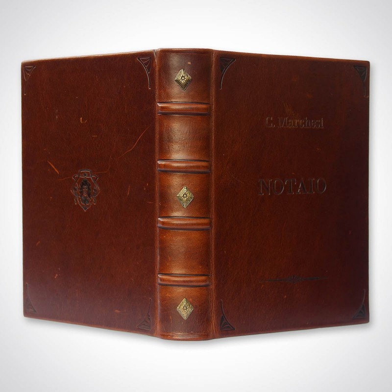 La legatura in pelle di capra, i nervi in rilievo e le borchie decorative evocano il fascino dei volumi antichi.